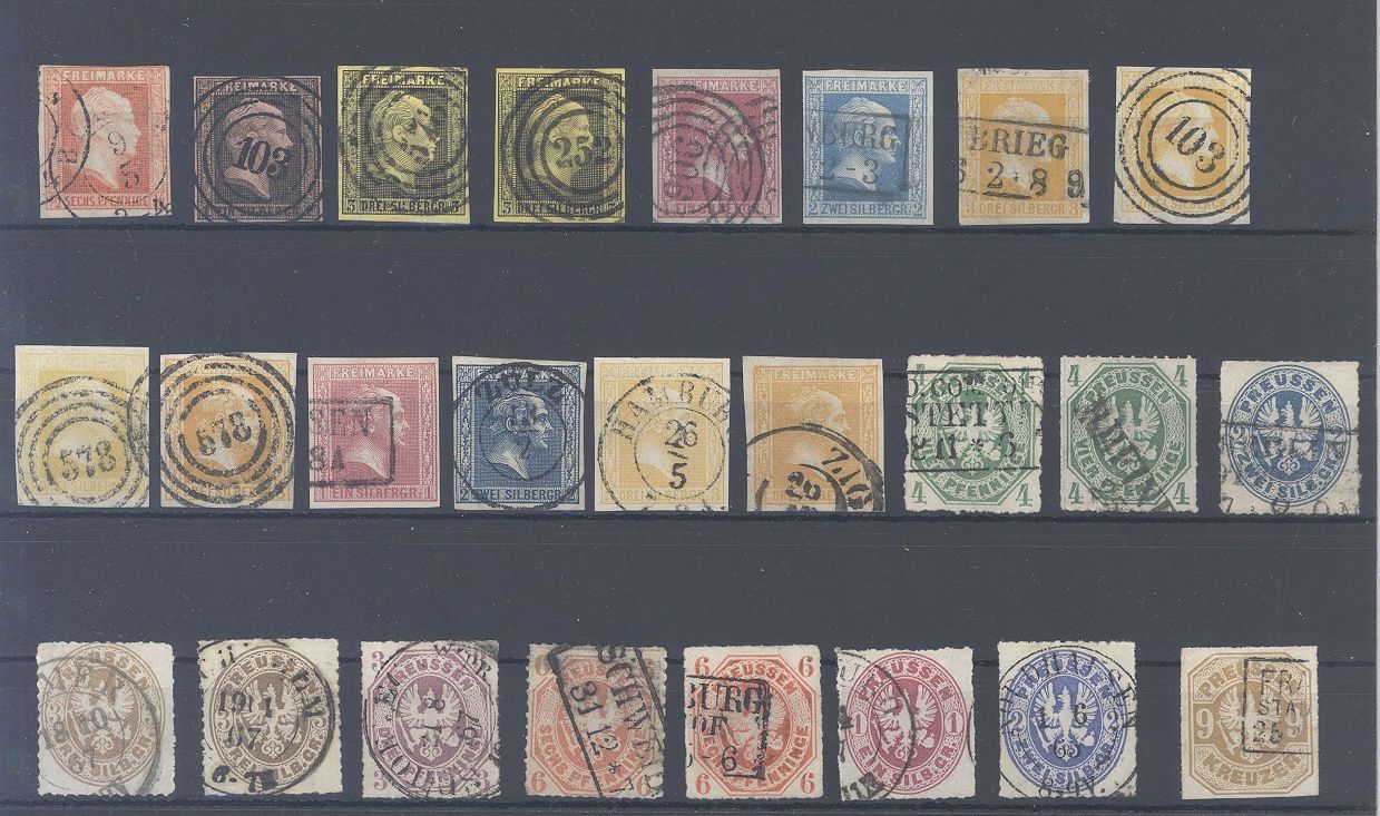 Preußen, gestempelter Posten mit besseren Werten ab Michel Nummer 1 auf Steckkarte. Dabei auch sehr chancenreich hinsichtlich Farben, die billigste Farben werten bereits mit 686,00 Euro.