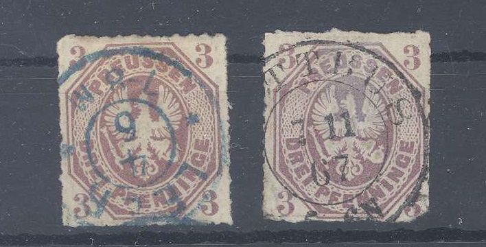 Preußen Michel Nummer 19a/b, 3 Pfg. Freimarke 1865 gestempelt in beiden Farben gestempelt, die Michel Nummer 19b hat einen Eckfehler. Billigst!