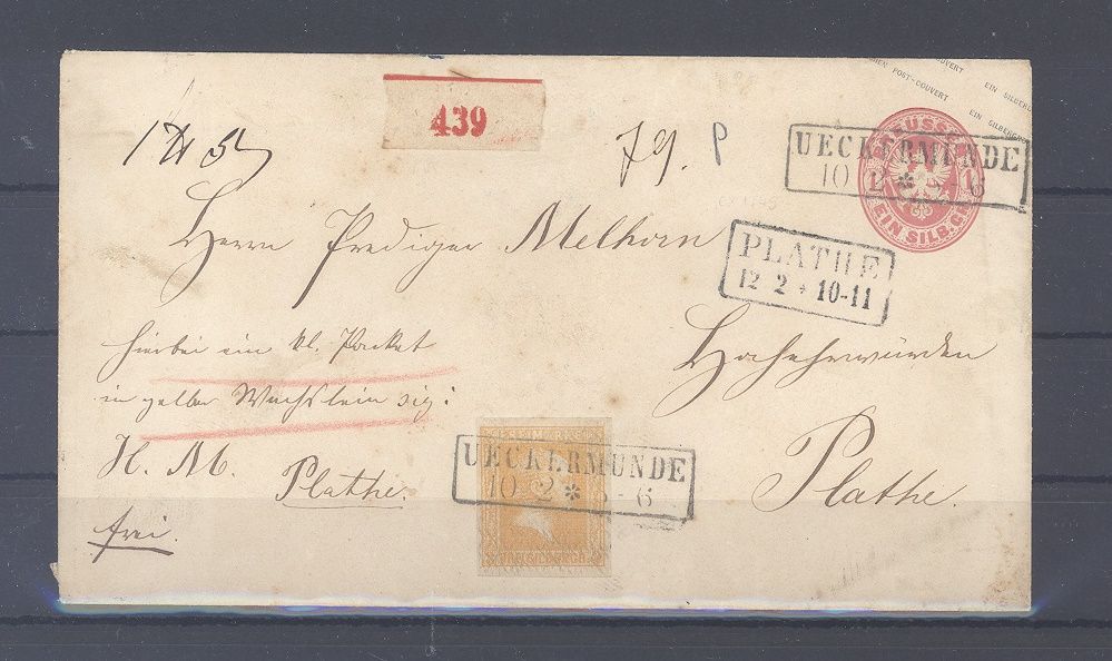 Preußen, interessante Siegel Paketbegleit GA mit 3 Sgr. ZuF aus Ueckermünde nach Plathe gelaufen. Nette Ergänzung zur Sammlung!
