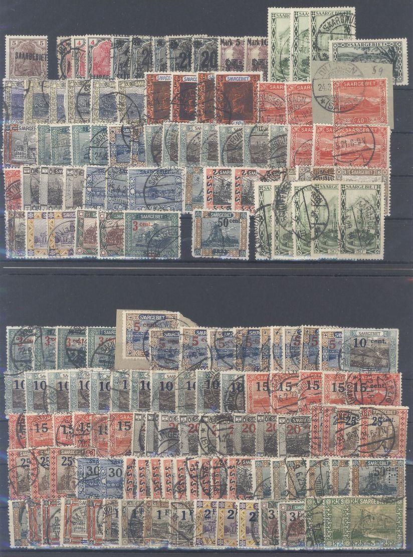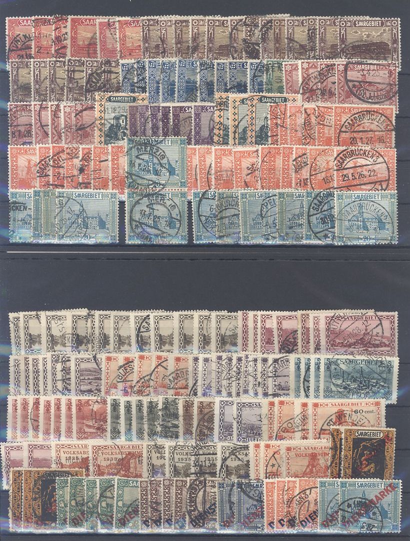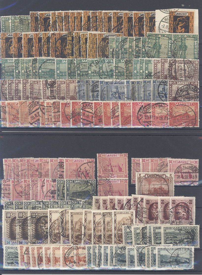 Saargebiet, enormer gestempelter Posten auf sechs Steckkarten, einfach zusammengesteckt. Vollkommen unberechnet, könnte ein nette kleine Fundgrube hinsichtlich Stempeln, Typen, Farben, sein
