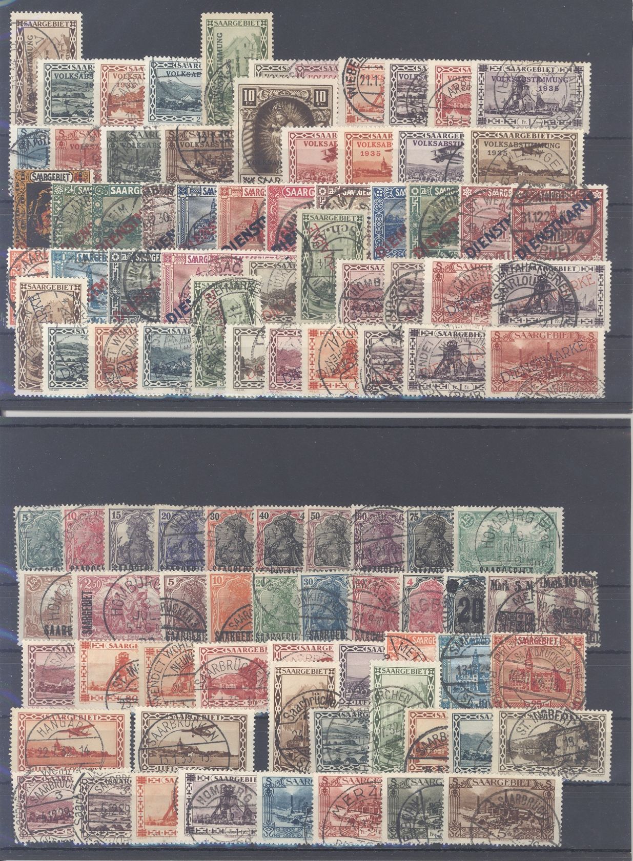 Saargebiet, recht umfangreicher gestempelter Posten mit auch besseren Werten wie Michel Nummer 158/59 und 179/94, werten bereits mit 275,00 Euro, auf zwei Steckkarten, einfach zusammengesteckt.