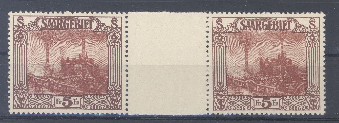 Saargebiet Michel Nummer 97, 5 Fr. Freimarken 1922 als ** Zwischenstegpaar. Nette Ergänzung zur Sammlung!