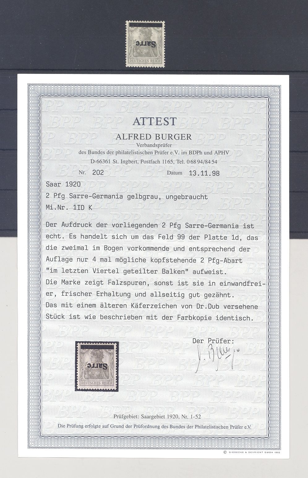 Saargebiet Michel Nummer 1 ID K, die 2 Pfg. Sarre Ausgabe mit kopfstehendem Druck ungebraucht *, ein sehr schöner Wert. Es liegt ein FA BPP vor, ist mit eingescannt, hat bereits einiges gekostet.