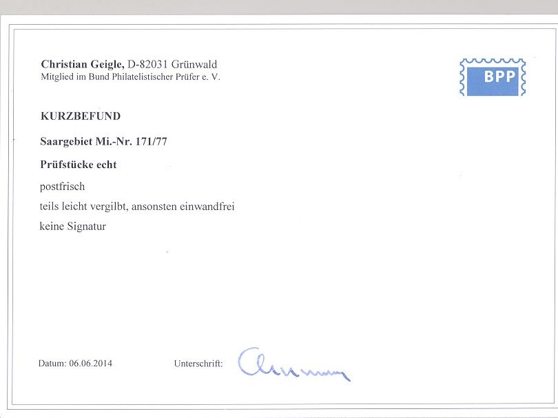Saargebiet Michel Nummer 171/205, der Jahrgang 1934 ** in leicht unterschiedlicher, insgesamt doch ordentlicher Erhaltung. Für die Michel Nummern 171/77 und 193/94 liegt ein Befund BPP vor, hat bereits einiges gekostet, ist mit eingescannt.