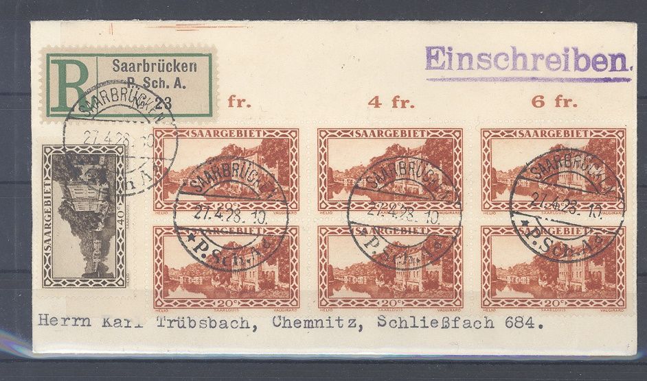 Saargebiet, sehr dekorativer Einschreib - Brief aus dem Jahr 1928 frankiert mit u.a. einer Sechserblock Frankatur vom Oberrand aus St. Wendel nach Chemnitz mit rückseitigem Ankunftsstempel gelaufen. Sehr schöne Ergänzung zur Sammlung!