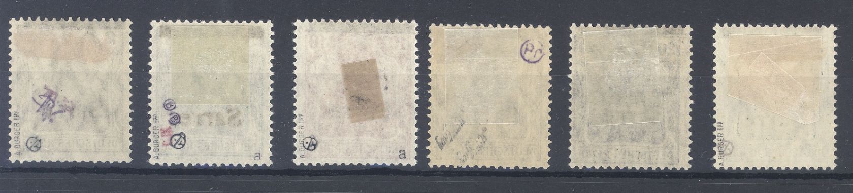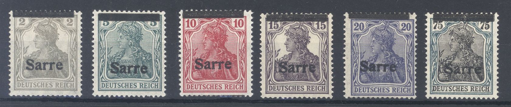 Saargebiet Sarre Ausgaben, fünf verschiedene ungebrauchte * Werte mit dem Aufdruckfehler II., verschobener Druck, nur die Balken sind oben. Vier Werte sind geprüft BPP.