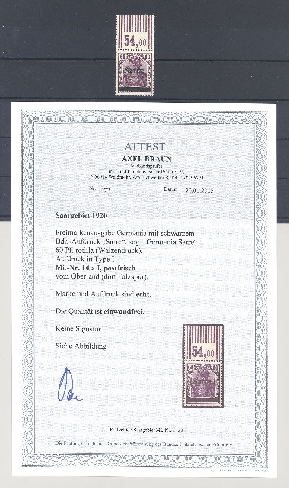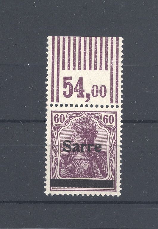 Saargebiet Sarre Ausgaben Michel Nummer 14 a I, die 60 Pfg. Germania Freimarke in der guten Type I **, ein schöner Wert sogar vom Oberrand, dort eine Falzspur. Es liegt ein FA BPP vor, ist mit eingescannt, hat bereits einiges gekostet.