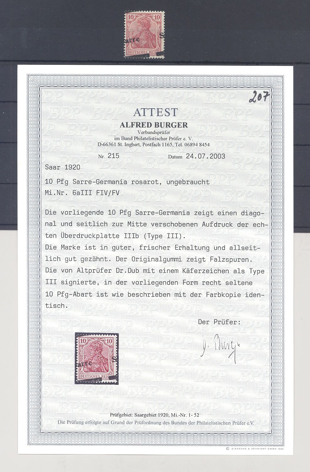 Saargebiet Sarre Ausgaben Michel Nummer 6a III FIV/V, die 10 Pfg. Germania mit interessantem verschobenem Aufdruck ungebraucht *. Es liegt ein FA BPP vor, ist mit eingescannt, hat bereits einiges gekostet, wie im FA angegeben selten einmal angeboten.