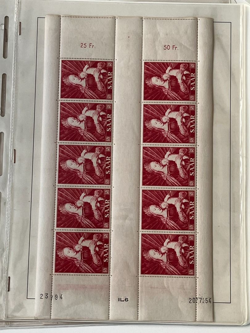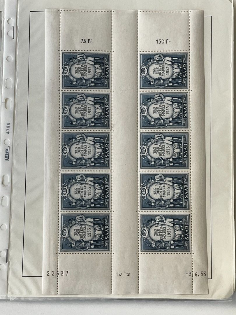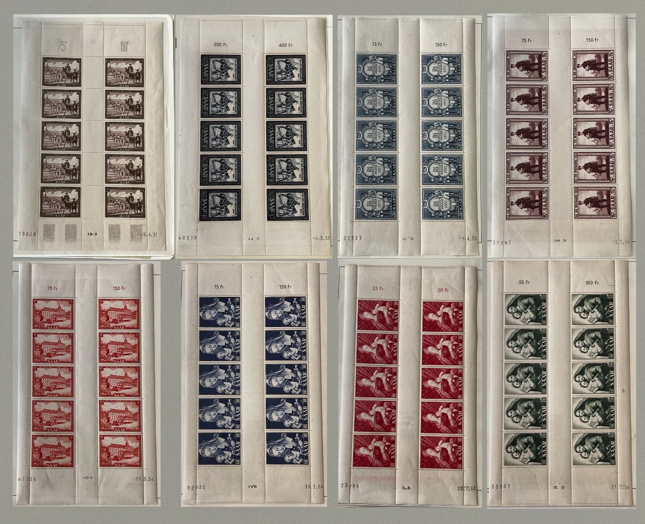Saarland 1947-1959, postfrische Bogensammlung mit Mi 305, 316, 342, 349, 351 - 353, 361. Teilweise mit Papierknitter, sonst gesamte gute Qualität