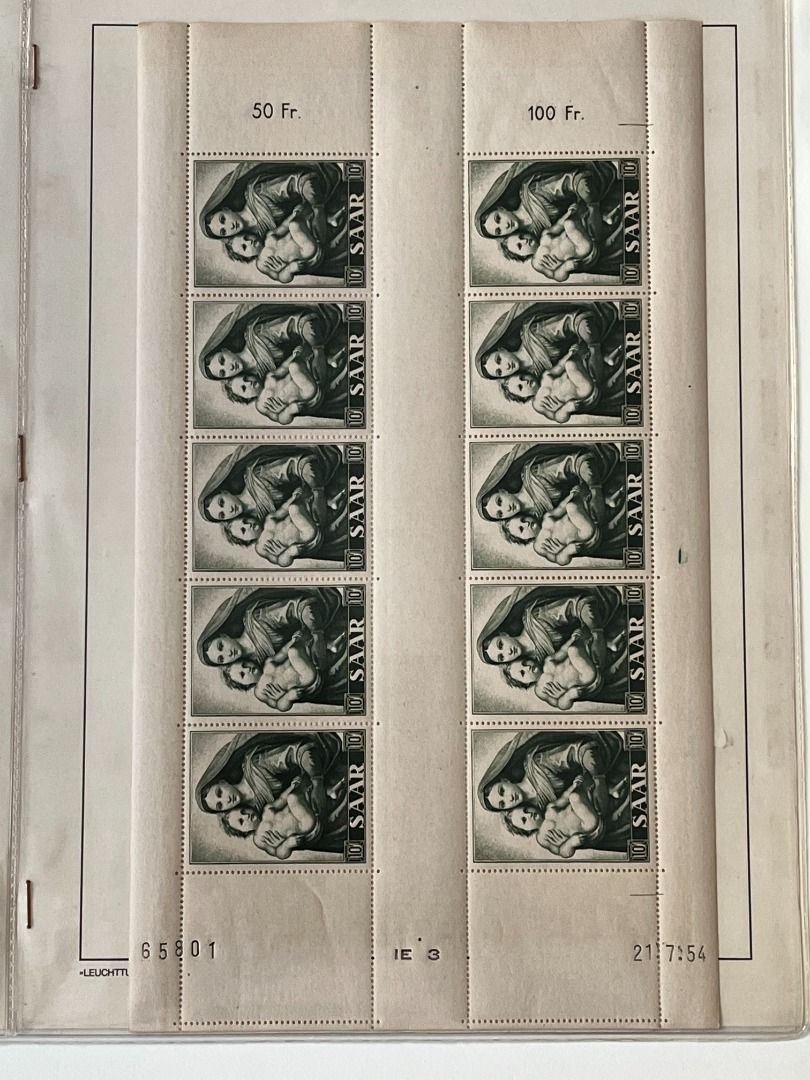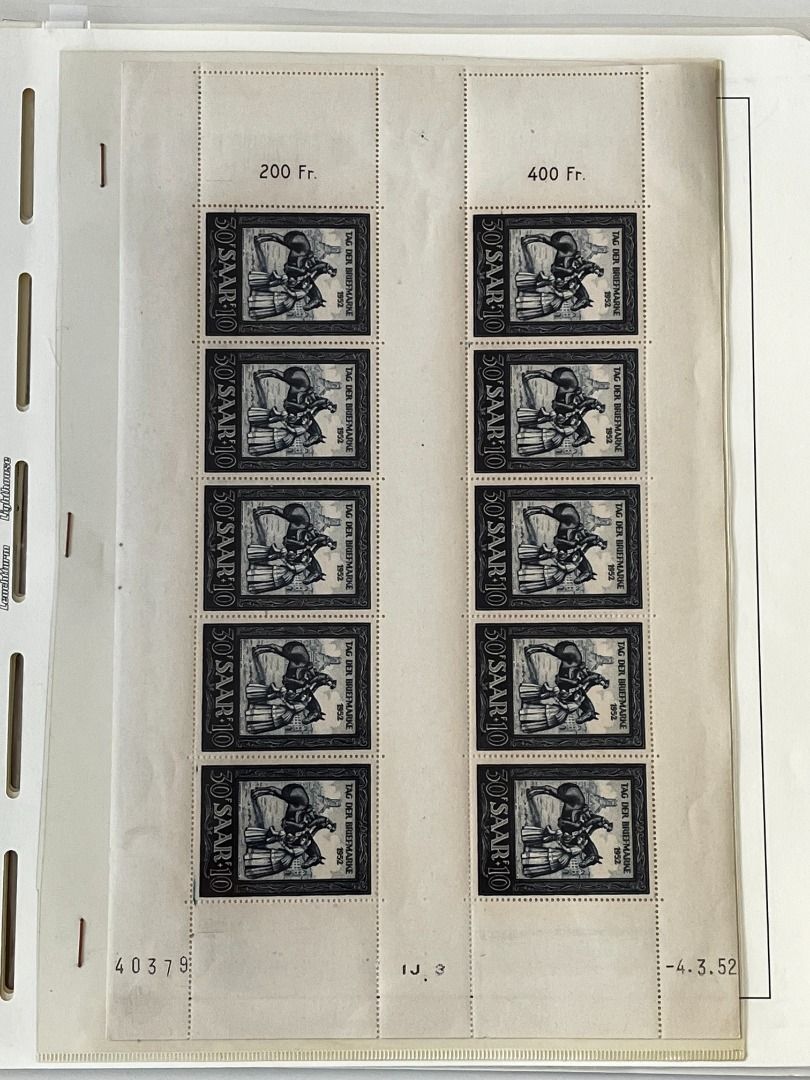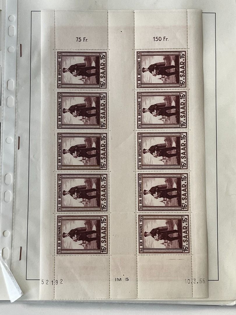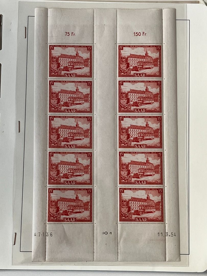 Saarland 1947-1959, postfrische Bogensammlung mit Mi 305, 316, 342, 349, 351 - 353, 361. Teilweise mit Papierknitter, sonst gesamte gute Qualität