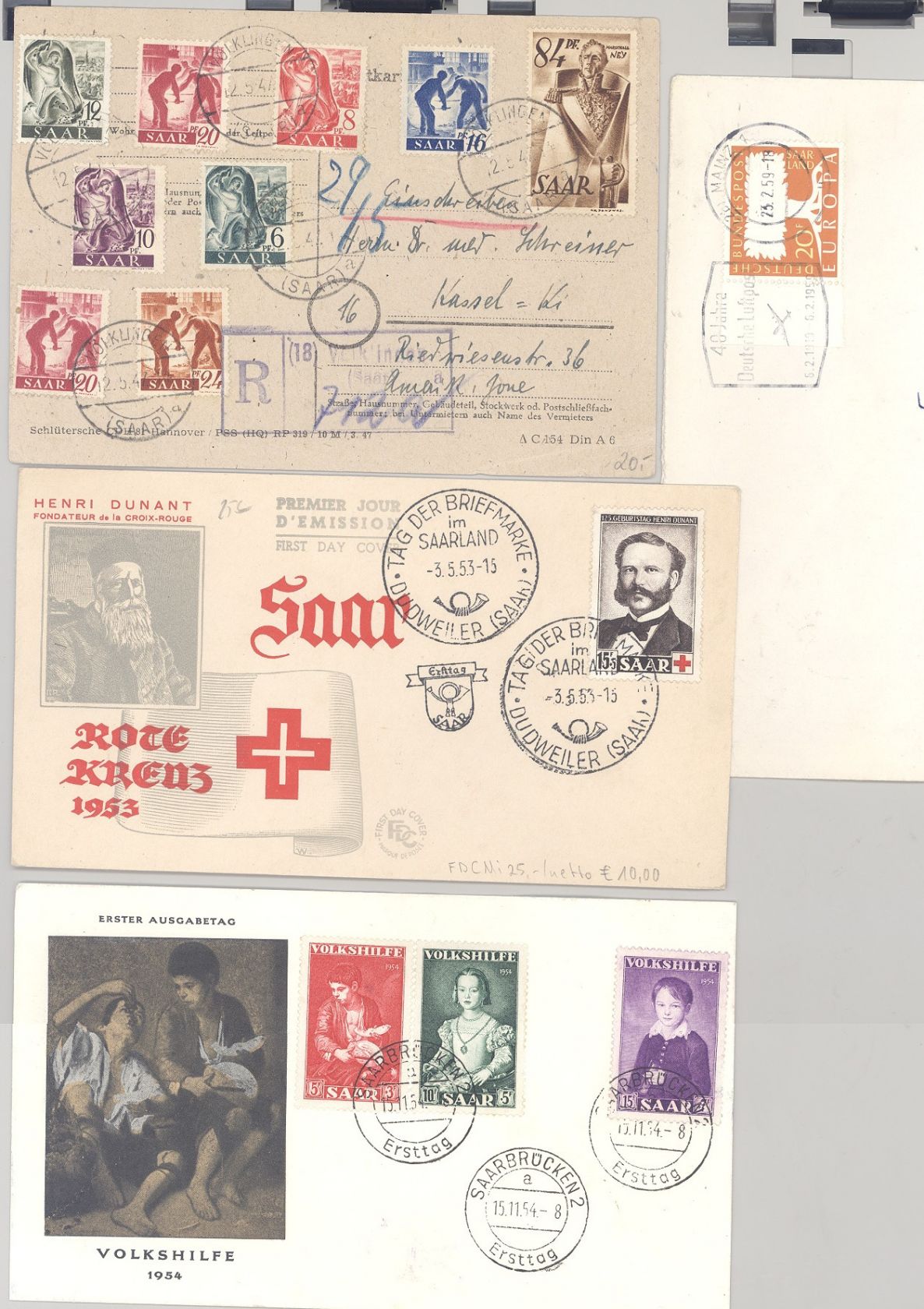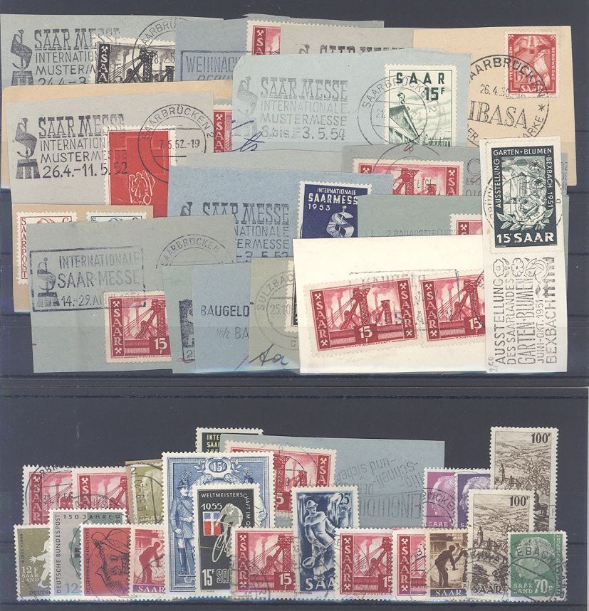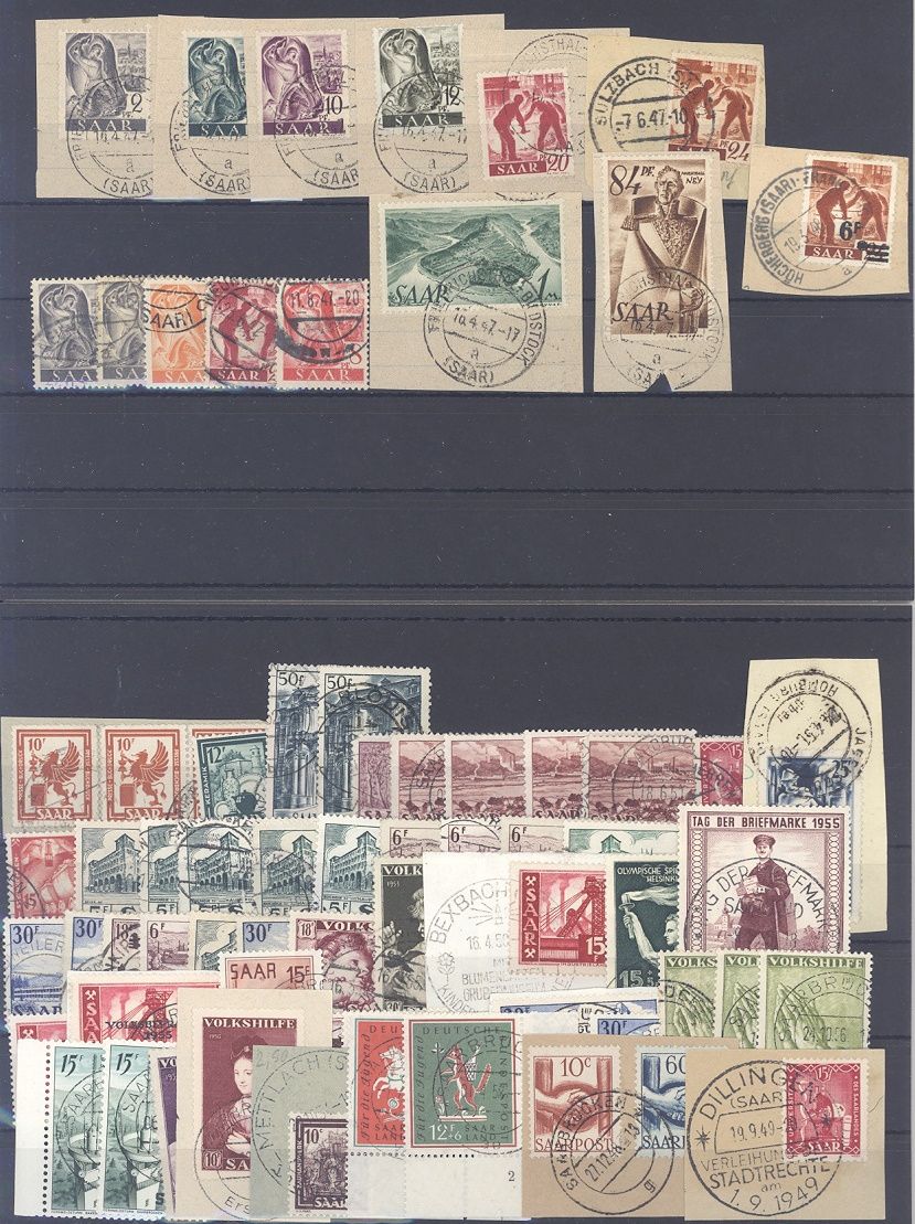 Saarland, recht umfangreicher gestempelter Posten auf drei Steckkarten und vier Belegen, dabei auch viele Briefstücke, einfach zusammengesteckt. Vollkommen unberechnet, sollte ein nettes Schnäppchen sein...