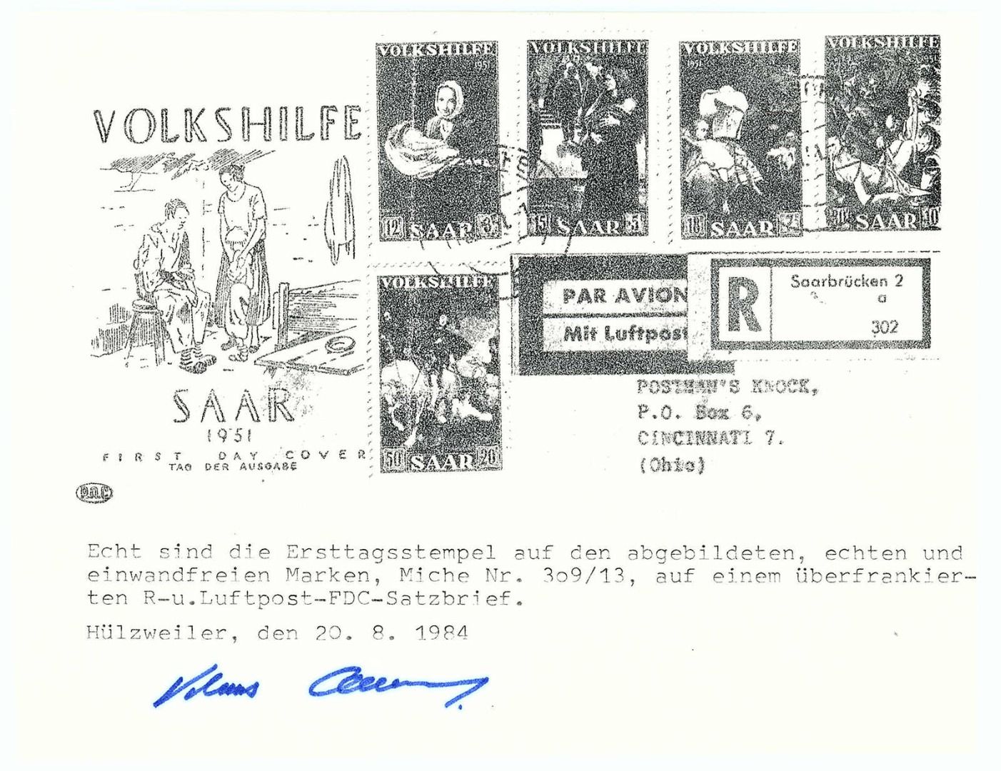 12+3 Fr. - 50+20 Fr. Volkshilfe (Gemälde) 1951, kompletter Satz als R-Ersttagsbrief, entwertet ,,SAARBRÜCKEN 3.11.51". Fotobefund Hoffmann BPP , einwandfrei, ME. 400,-€