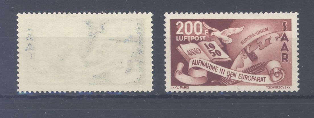 Saarland Michel Nummer 297/98, Europarat 1950 */**. Die Michel Nummer 297 ist ** mit rückseitigem Farbabklatsch, die Michel Nummer 298 ungebraucht *. Der Michel für ** beträgt 230,00 Euro.