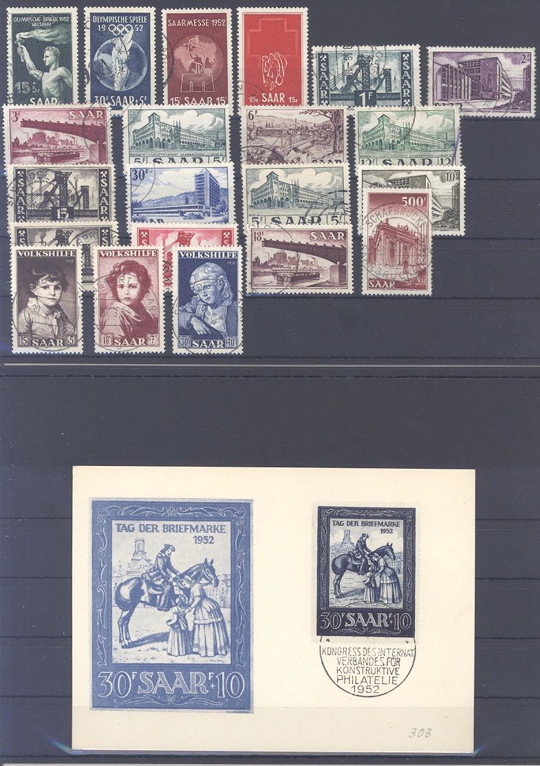 Saarland Michel Nummer 314/40, der Jahrgang 1952 gestempelt, die Michel Nummer 316 ist auf einem Beleg statt lose gestempelt, dies blieb unberechnet.