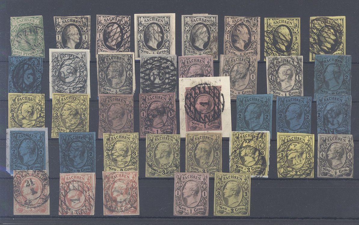 Sachsen, gestempelter Posten ab Michel Nummer 2 und auch 2 x Michel Nummer 6 und 3 x Michel Nummer 12, werten bereits mit 450,00 Euro, auf Steckkarte, könnte auch chancenreich hinsichtlich Farben sein. Sicherlich nicht teuer