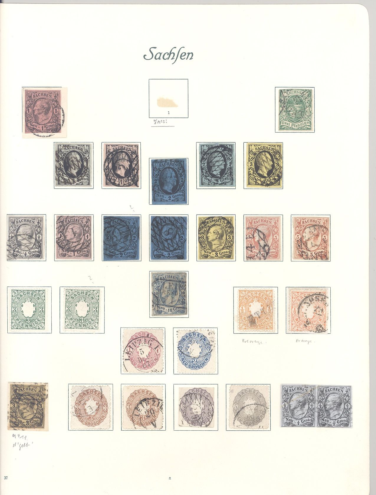 Sachsen Michel Nummer 2/19, Freimarken 1851/63 überkomplett gestempelt in wie üblich unterschiedlicher Erhaltung auf altem Sammlungsblatt. Stets billigste Farben und Varianten gerechnet,