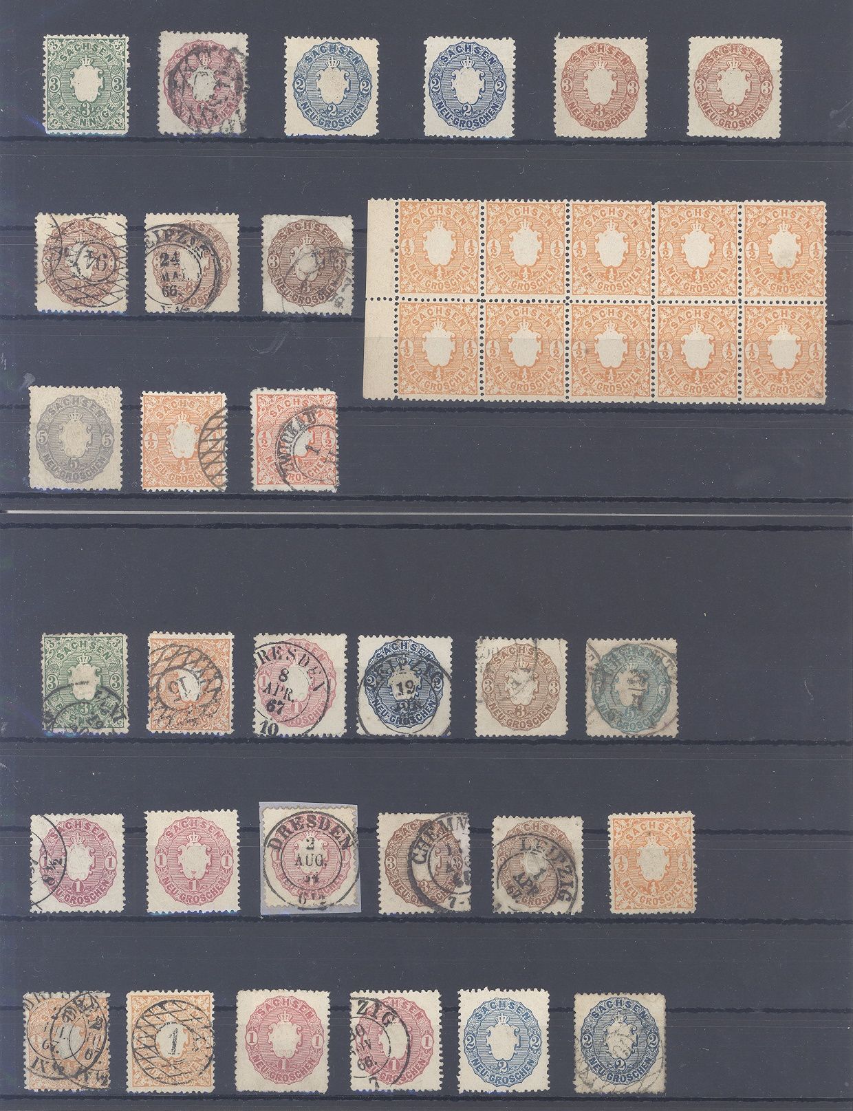Sachsen, recht interessanter Posten aus Michel Nummer 14/19, Freimarken 1863 mit auch einem wohl ** Zehnerblock und auch durchaus chancenreich hinsichtlich Farben. Sollte ein nettes Schnäppchen sein!