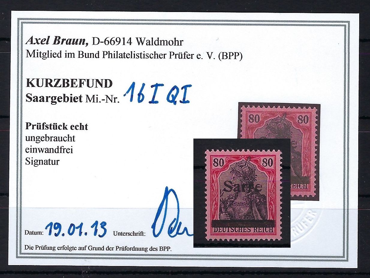 Sarre 16 I Q I *, einwandfrei, Originalgummi, KB Braun BPP