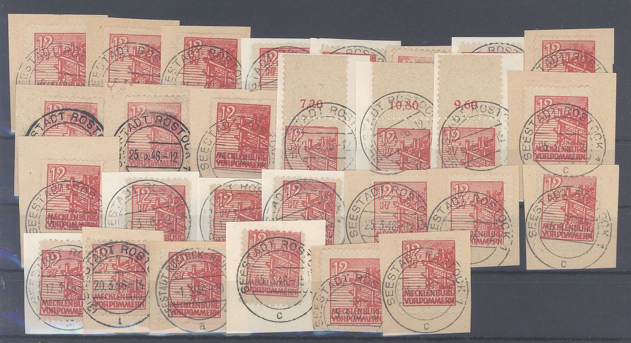SBZ, 29 x Michel Nummer 36y, 12 Pfg. Freimarke 1946 dunkles Papier gestempelt auf Briefstücken als Posten. Könnte chancenreich hinsichtlich Farben, Abarten,.. sein.