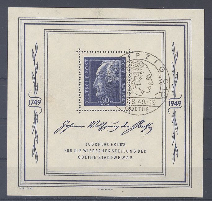 SBZ Block 6, der Goetheblock 1949 mit gutem SST Leipzig C 1, Goethe, etwas fleckig sonst ein ordentlicher Block. Der Block ist geprüft BPP.