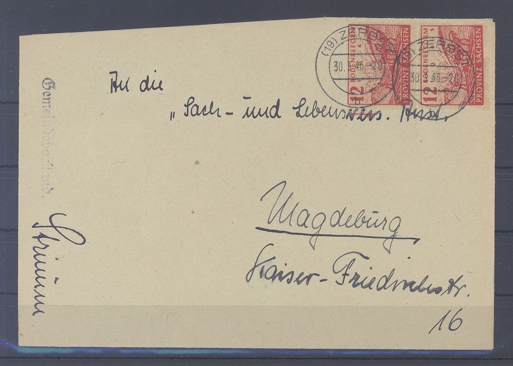 SBZ, interessanter oben durch wohl Öffnung beschnittener Brief frankiert mit 2 x Michel Nummer 86, 12 Pfg. gezähnt als MeF aus Zerbst. Nette Ergänzung zur Sammlung.