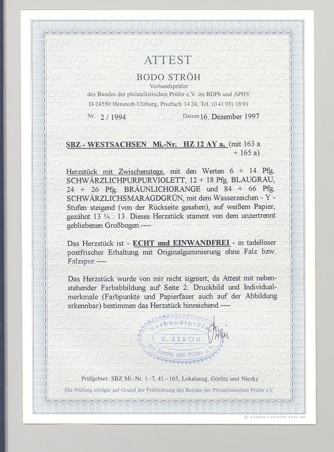 SBZ HZ 12 Y A a , der Innenteil aus Großbogen in der Variante A X a ** in sehr guter Erhaltung. Es liegt ein FA BPP vor, ist mit eingescannt, hat bereits einiges gekostet, der Michel ist nur -,-, große Rarität!