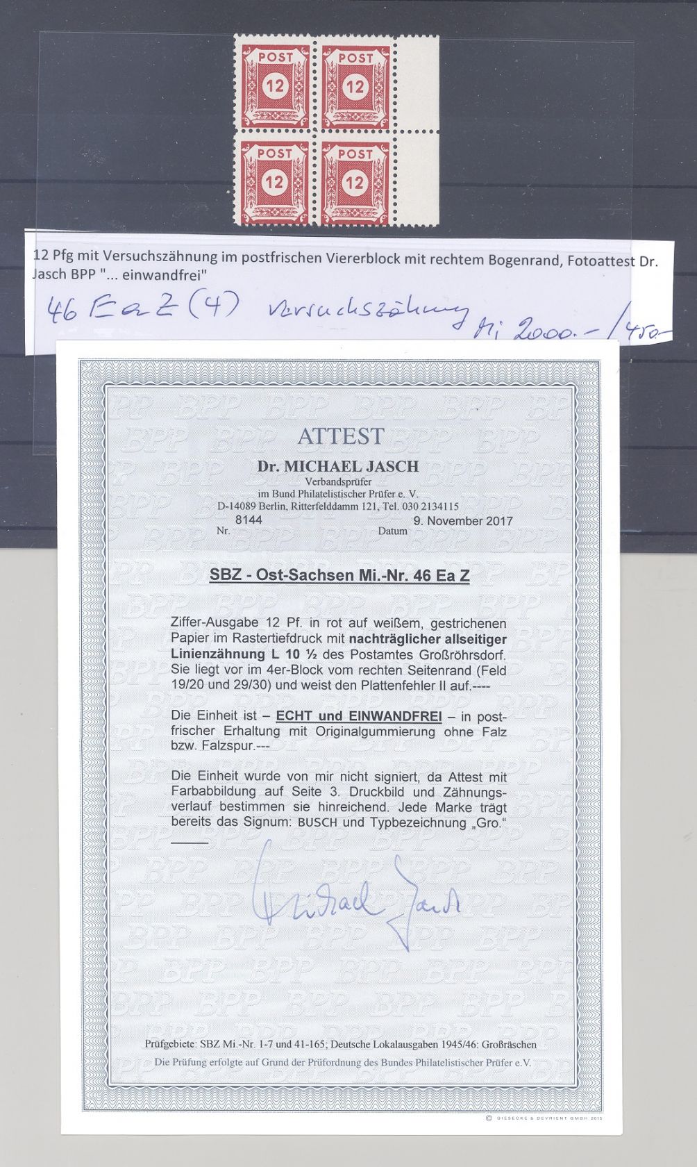 SBZ Michel Nummer 46 Ea Z, die seltene 12 Pfg. Großröhrsdorf Versuchzähnung ** im Viererblock in sehr guter Erhaltung. Es liegt ein FA BBP aus dem ehemaligen Viererblock vor, hat bereits einiges gekostet, ist mit eingescannt.