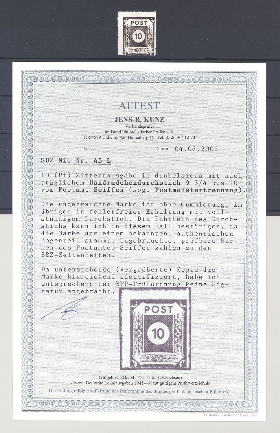 SBZ Michel Nummer 45 L, die 10 Pfg. Freimarke mit der Seiffen Postmeistertrennung ungebraucht (*), ein sehr schöner Wert. Es liegt ein FA BPP vor, ist mit eingescannt, hat bereits einiges gekostet, wie im FA auch angegeben selten einmal angeboten! Der Michel für ** beträgt 2.500,00 Euro.