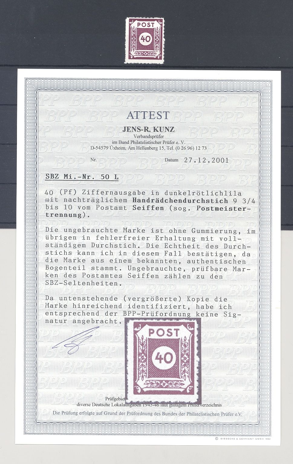 SBZ Michel Nummer 50a L, die 40 Pfg. Freimarke mit der Seiffen Postmeistertrennung ungebraucht (*), ein sehr schöner Wert. Es liegt ein FA BPP vor, ist mit eingescannt, hat bereits einiges gekostet, wie im FA auch angegeben selten einmal angeboten! Der Michel für ** beträgt 2.500,00 Euro.