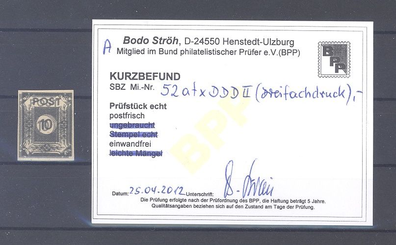 SBZ Michel Nummer 52 atx DDD II, 10 Pfg. Freimarke 1945 mit Dreifachdruck **. Es liegt ein Befund BPP, hat bereits einiges gekostet, ist mit eingescannt.