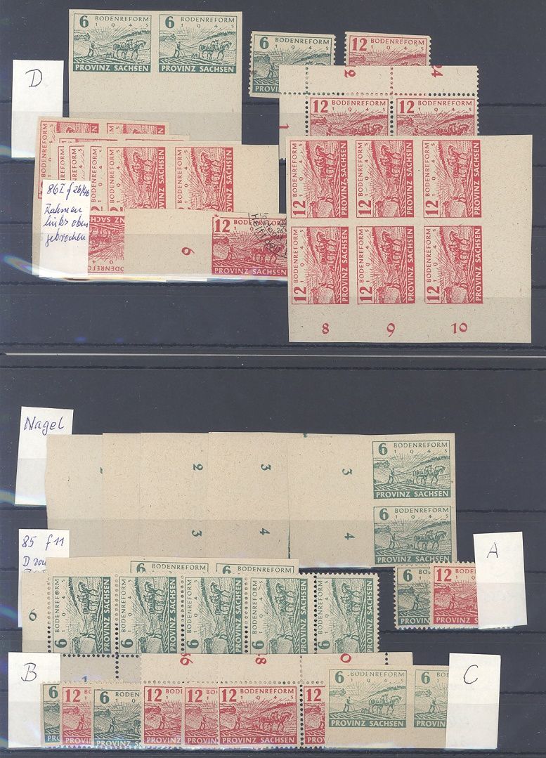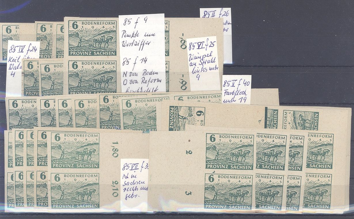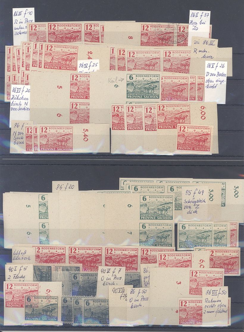 SBZ, sehr umfangreicher ** Posten aus Michel Nummer 85/86, Bodenreform 1945 auf 5 Steckkarten. Die Zettel des Sammlers sind beigefügt, sollte chancenreich und in jedem Fall bereits aufgrund der Materialfülle ein nettes Schnäppchen sein...