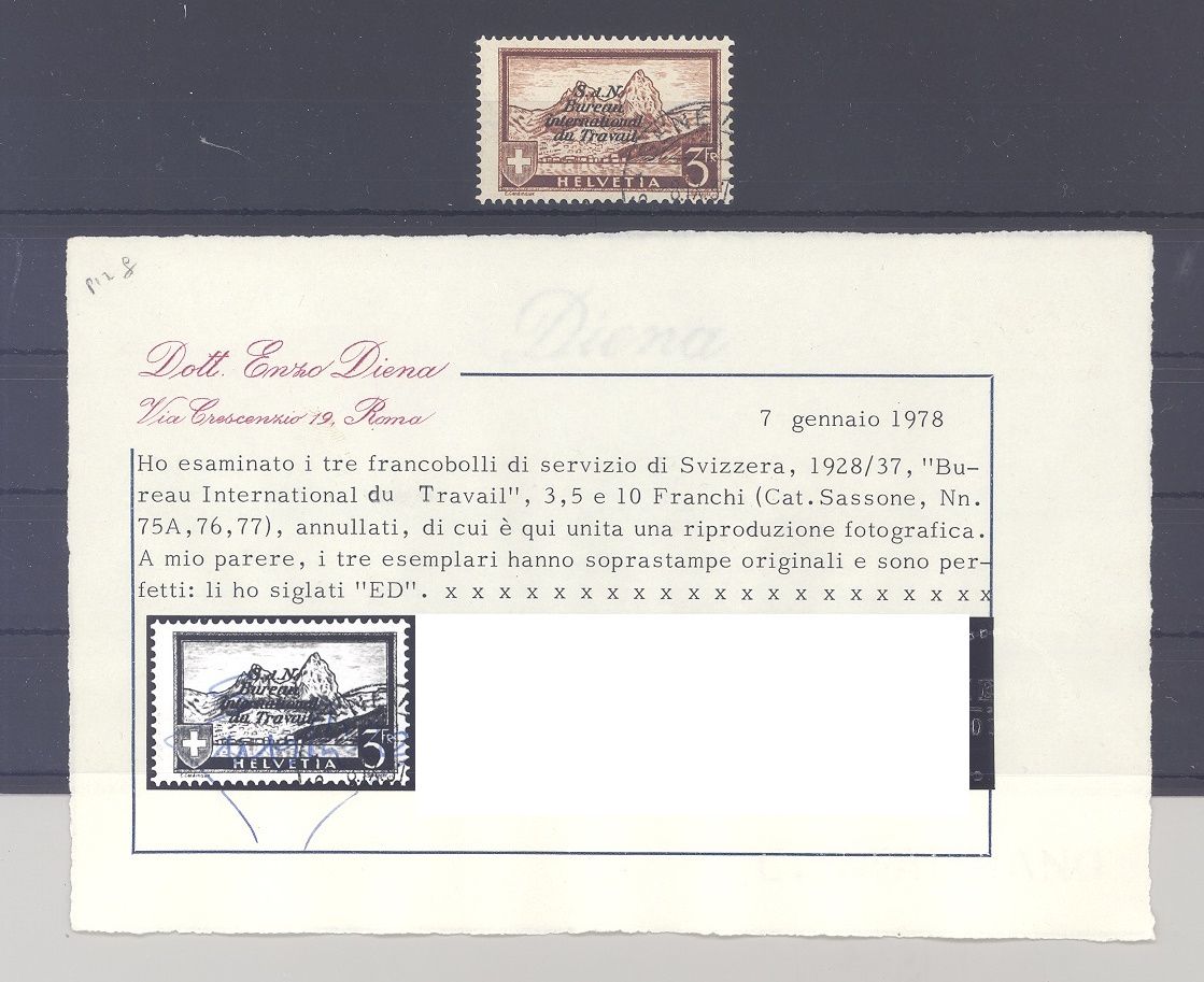 Schweiz Arbeitsorganisation Michel Nr. 48, 3 Fr. Freimarke 1937 gestempelt. Es liegt ein Befund Diena vor, der auf einem Befund drei Marken befundet hat. Die hier entsprechende Marke ist abgebildet, die beiden anderen Marken gehören nicht zum Angebot.