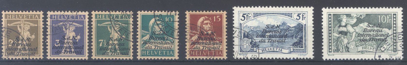 Schweiz Völkerbund Michel Nummer 25/31, Freimarken 1927/39 gestempelt mit Gummierung. Für die wichtigen Michel Nummern 30/31 liegt ein Befund Diena vor, der drei Marken in einem Befund befundet hat. Die hier entsprechende Marke ist abgebildet, die beiden anderen Marken gehören nicht zum Angebot.