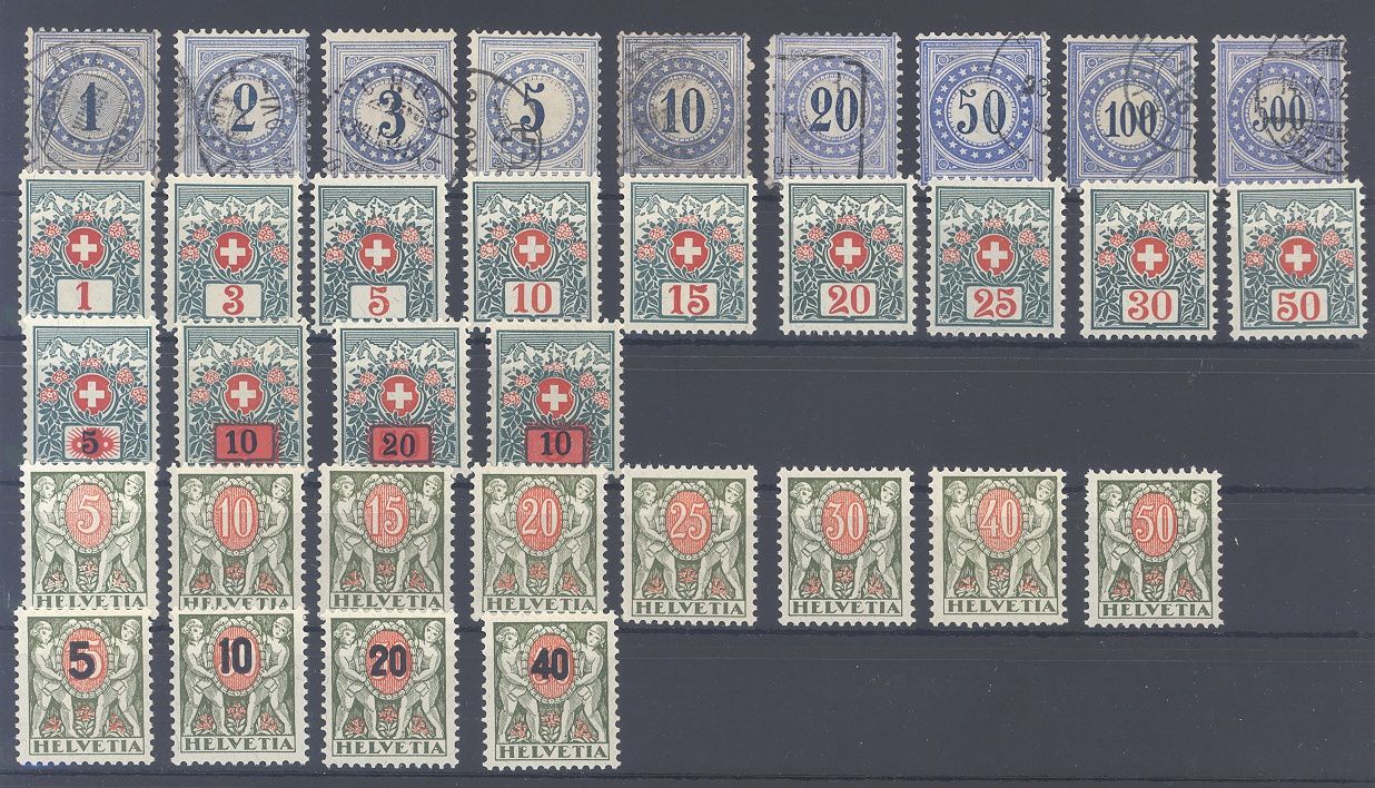 Schweiz, **/gestempelter Posten Portomarken ab 1878 mit auch Michel Nummer 1/9 auf Steckkarte.