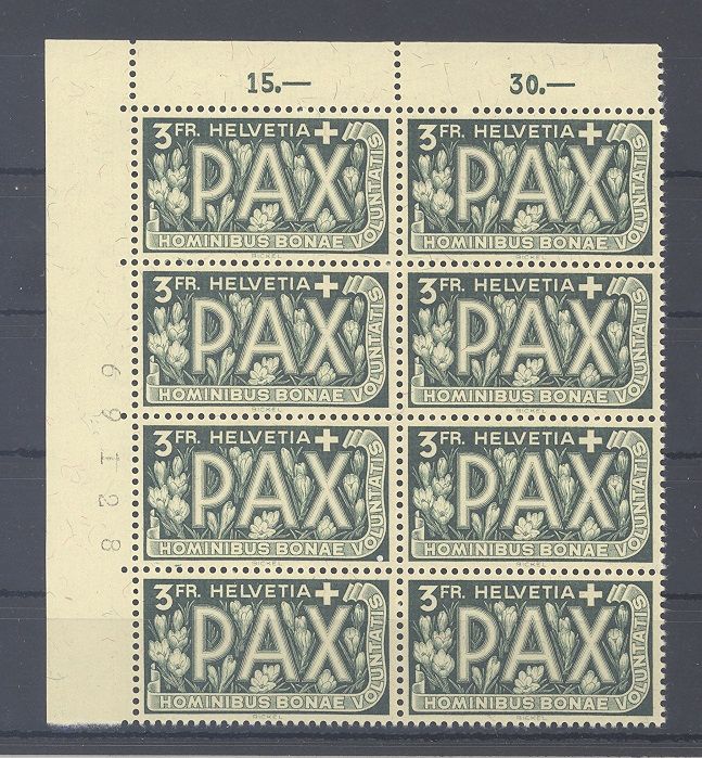 Schweiz Michel Nummer 457, 3 Fr. Pax 1945 im ** Achterblock vom Eckrand. Billigst...