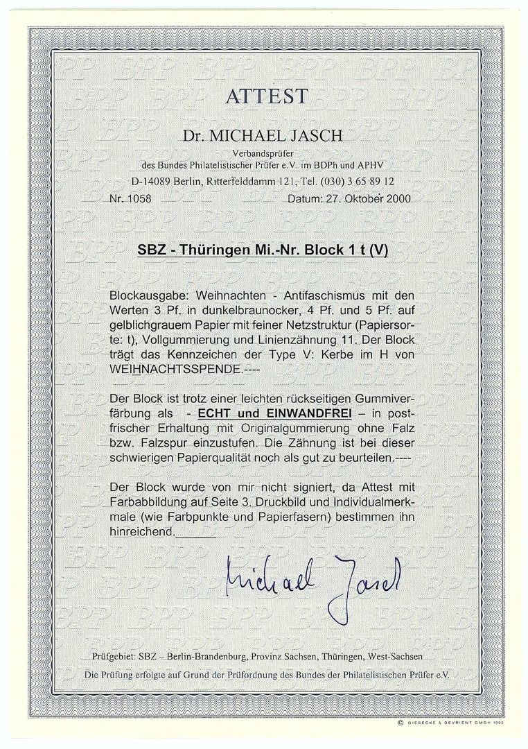 Kleiner Weihnachtsblock 1945, der Block ist trotz einer leichten rückseitigen Gummiverfärbung als echt und einwandfrei in postfrischer Erhaltung einzustufen, Papier ,,t". Fotoattest Dr. Jasch BPP. Mi. 1.600,-€
