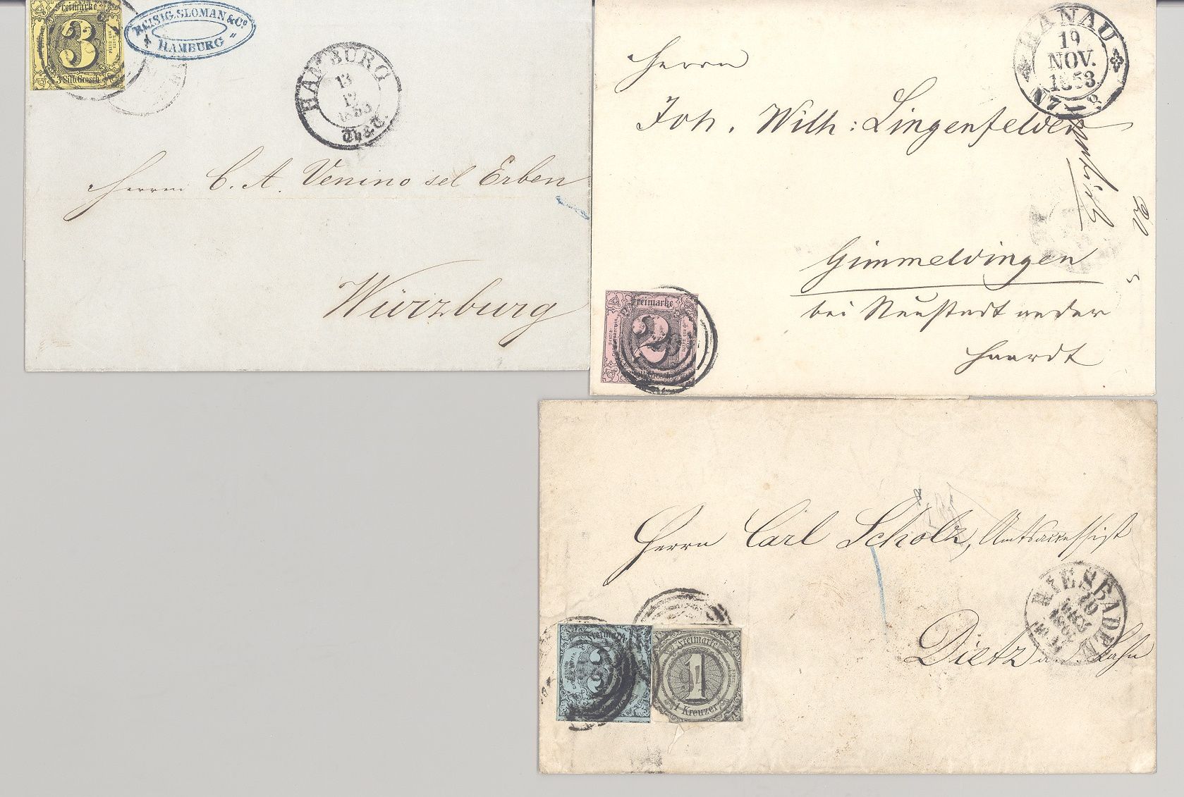 Thurn & Taxis, drei schöne Briefe frankiert mit verschiedenen Frankaturen als Posten, dabei auch eine MiF aus Wiesbaden. Nett!
