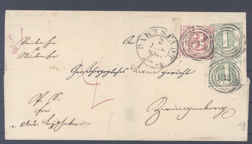 Thurn & Taxis, sauberer Brief aus dem Jahr 1862 frankiert auch mit 1 Kreuzer grün im Paar als MiF aus Darmstadt gelaufen. Nette Ergänzung zur Sammlung.
