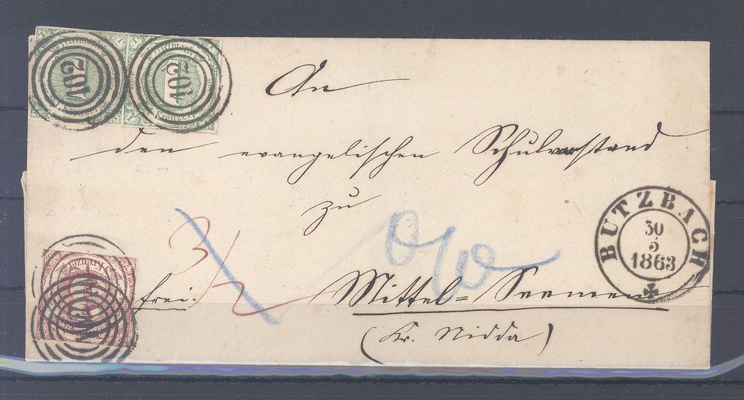 Thurn & Taxis, sauberer Siegel Brief frankiert mit 1 Kreuzer im Paar als MiF aus Butzbach mit rückseitigem Ankunftsstempel gelaufen. Nette Ergänzung zur Sammlung.