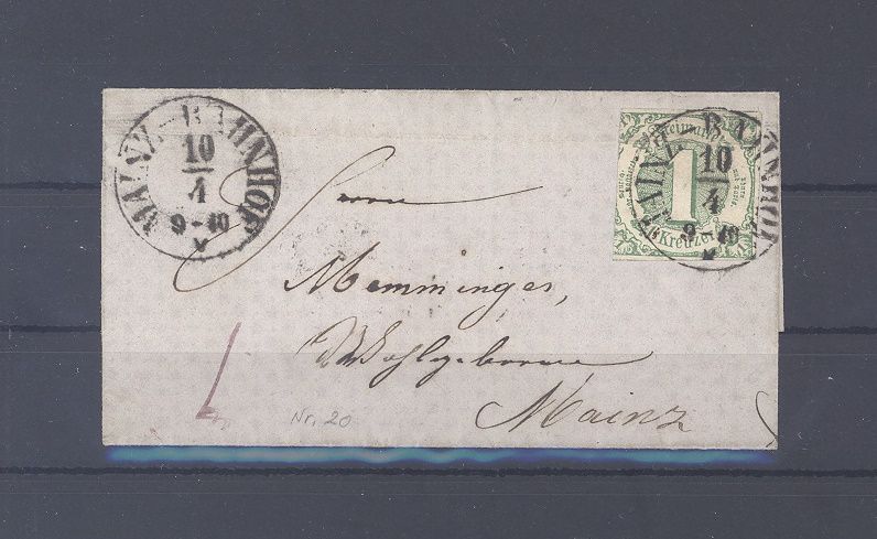 Thurn & Taxis, sauberer Brief frankiert mit Michel Nummer. 20, 1 Kreuzer grün als EF mit Ortsstempel aus Mainz Bahnhof. Nette Ergänzung zur Sammlung.
