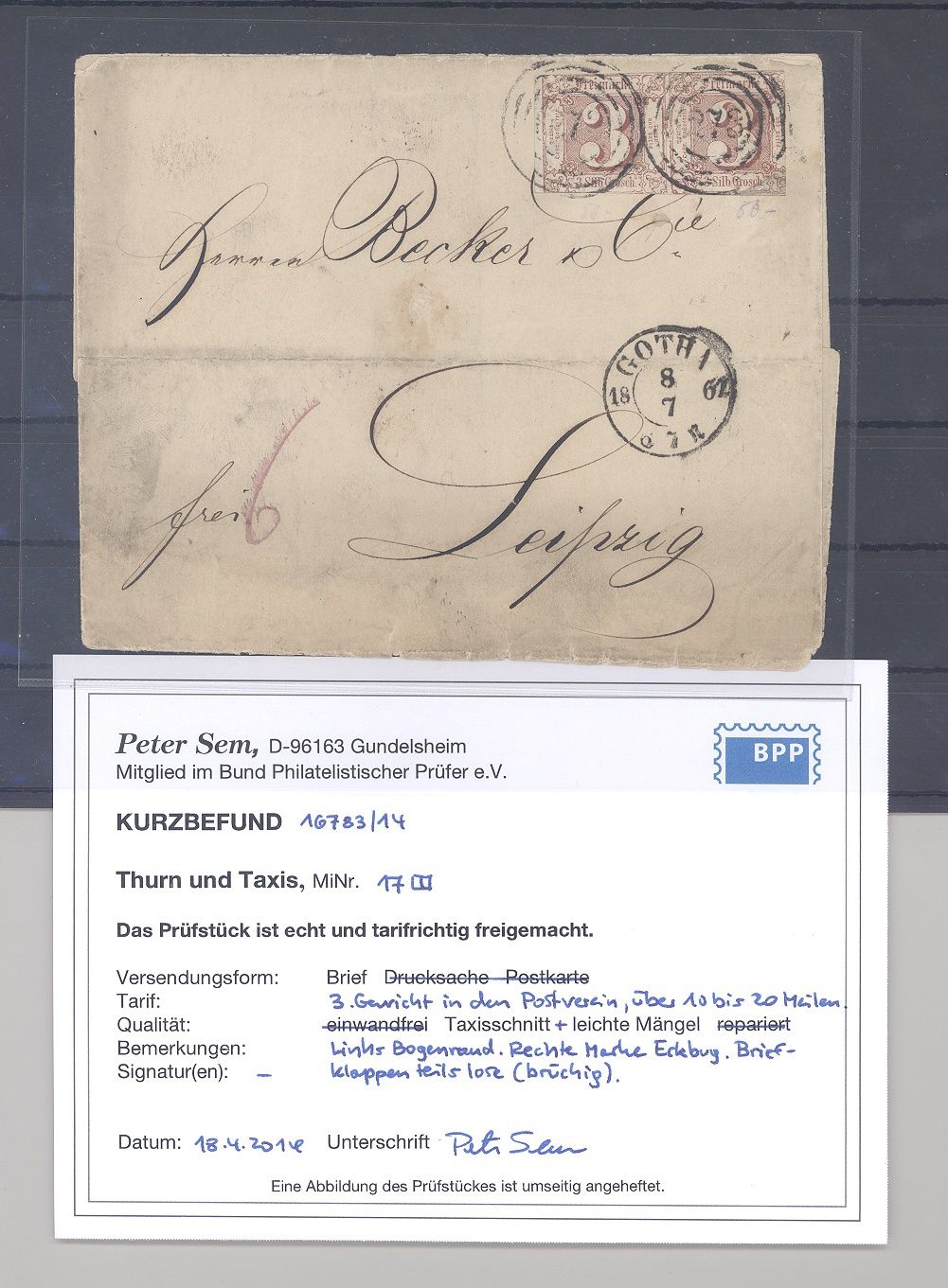 Thurn & Taxis, dekorativer Brief aus dem Jahrt 1862 frankiert mit einem Paar der Michel Nummer 17, 3 Sgr. Freimarke als MeF aus Gotha gelaufen. Es liegt ein Befund BPP vor, hat bereits einiges gekostet, ist mit eingescannt.