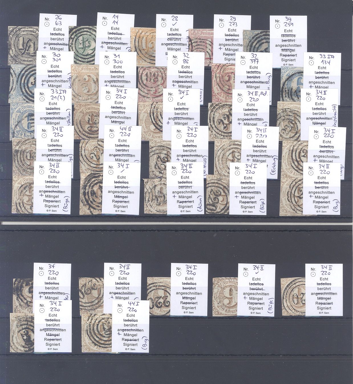 Thurn & Taxis, umfangreicher gestempelter Posten aus Michel Nummer 26/34, 3. Ausgabe mit vielen verschiedenen Nummernstempeln auf zwei Steckkarten. Jeder Wert ist geprüft, hat bereits wohl bald soviel gekostet...…