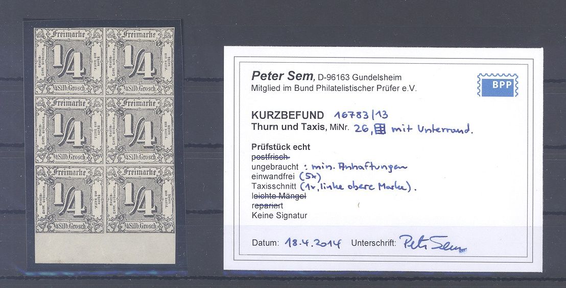 Thurn & Taxis Michel Nummer 26, 1/4 Silbergroschen Freimarke 1865 als ungebrauchter *, fast ** Sechserblock vom Rand, ein sehr ordentliche Einheit. Es gibt keinen Michel für Sechserblöcke. Es liegt ein Befund BPP vor, hat bereits einiges gekostet, ist mit eingescannt, ein Viererblock wertet bereits mit 140,00 Euro und ein Sechserblock ist natürlich noch einmal etwas ganz anderes...