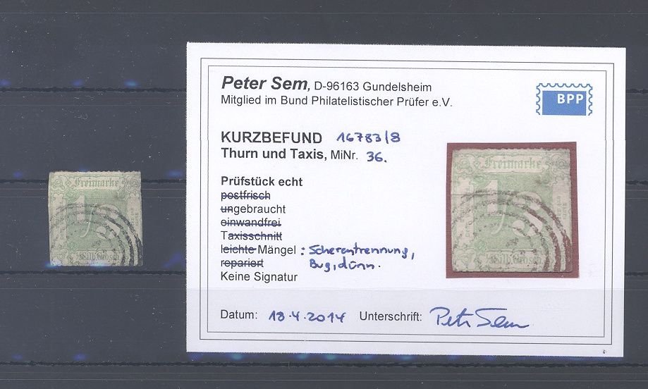 Thurn & Taxis Michel Nummer 36, 1/3 Groschen Freimarke 1865 gestempelt mit Mängeln. Es liegt ein Befund BPP vor, hat bereits einiges gekostet, ist mit eingescannt, billigst!