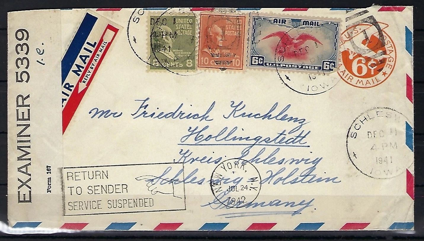 USA Flugpost am Tag der Kriegserklärung an Deutschland 11.12.1941, Retour