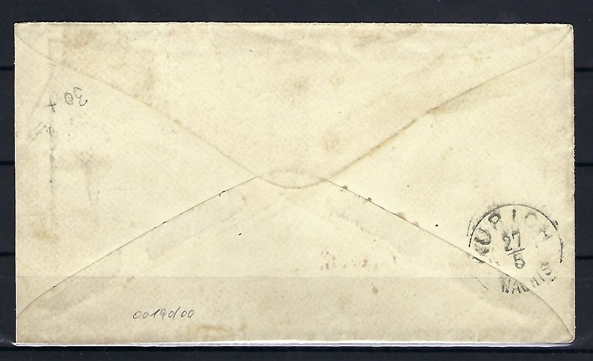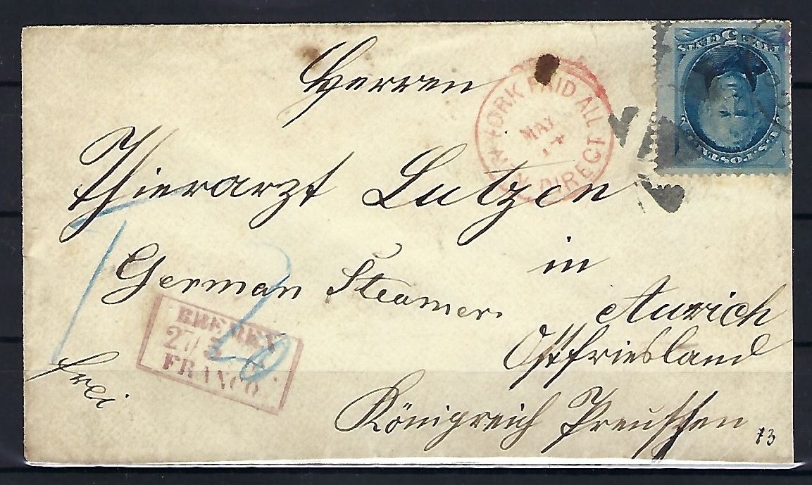 USA Mi 15 als EF befördert von New York nach Aurich, vorderseitig mit rotem Gebührenstempel K2 New York Paid sowie violettem Transitstempel Ra3 Bremen Franco