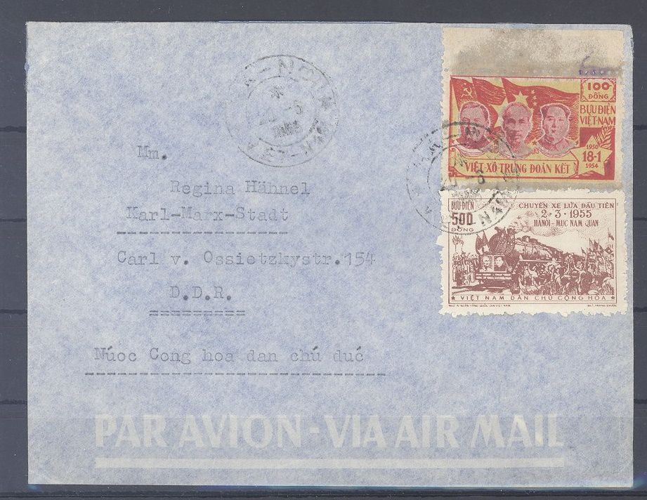 Vietnam, sauberer Brief aus dem Jahr 1956 frankiert mit Monat der Freundschaft und Eisenbahnlinie in die DDR gelaufen.