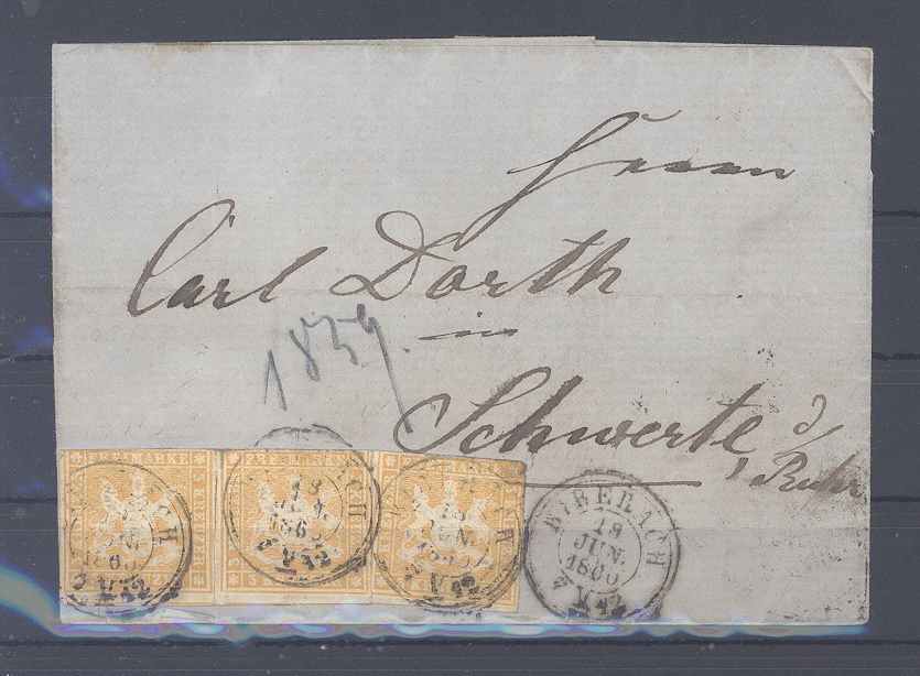 Württemberg, interessanter Bahnpost Brief frankiert mit 3 x 3 Kreuzer als MeF aus Biberach gelaufen. Nette Ergänzung zur Sammlung.