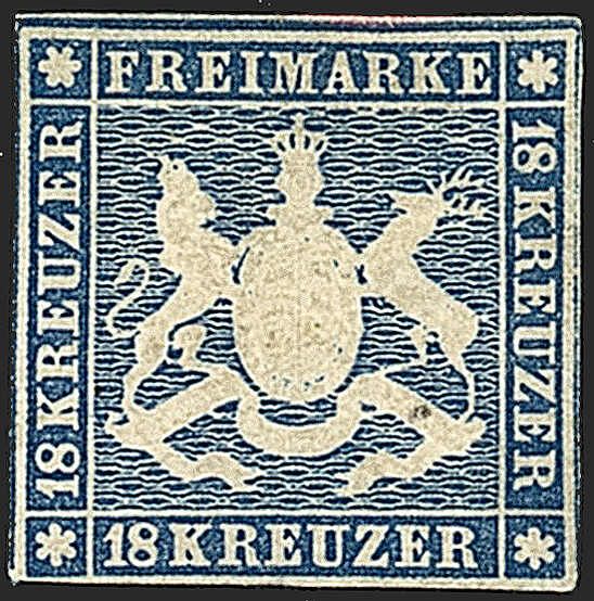 1859 18 Kr. Wappen von Württemberg 1859, sauber in ungebrauchter Erhaltung mit Falz, vollständiges Gummi, keine dünne Stellen, gute Gesamterhaltung. ME. 4.000,-€. Selten!