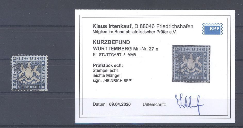 Württemberg Michel Nummer 27c, 6 Kreuzer Freimarke 1863 in der guten Farbe c gestempelt, ein ordentlicher Wert. Es liegt ein Befund BPP vor, hat bereits einiges gekostet, ist mit eingescanntt.